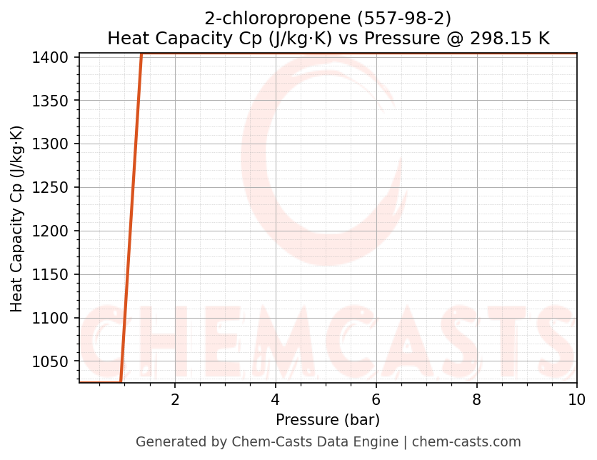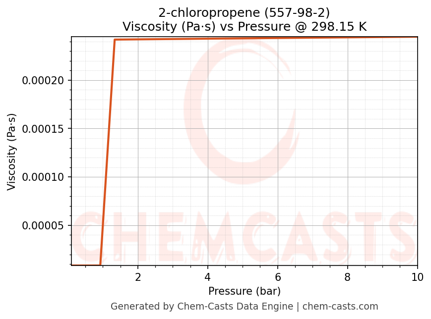 This page presents the pressure-dependent thermodynamic and transport properties of 2-chloropropene (CAS 557-98-2) calculated at a constant temperature of 298 K (25 °C) over the pressure range 0.10-10 bar.