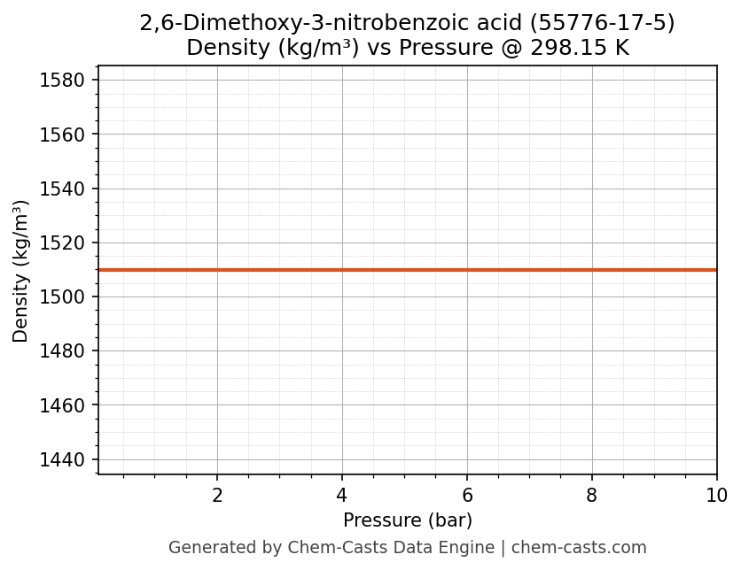 This page presents the pressure-dependent thermodynamic and transport properties of 2,6-Dimethoxy-3-nitrobenzoic acid (CAS 55776-17-5) calculated at a constant temperature of 298 K (25 °C) over the pressure range 0.10-10 bar.