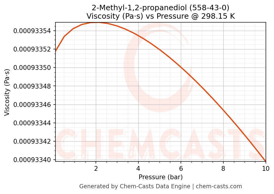 This page presents the pressure-dependent thermodynamic and transport properties of 2-Methyl-1,2-propanediol (CAS 558-43-0) calculated at a constant temperature of 298 K (25 °C) over the pressure range 0.10-10 bar.