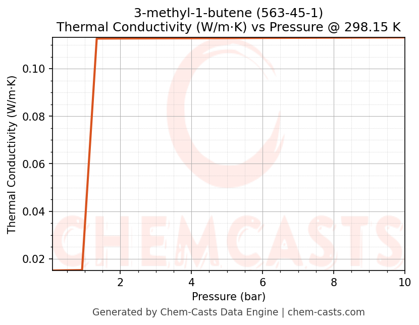 This page presents the pressure-dependent thermodynamic and transport properties of 3-methyl-1-butene (CAS 563-45-1) calculated at a constant temperature of 298 K (25 °C) over the pressure range 0.10-10 bar.
