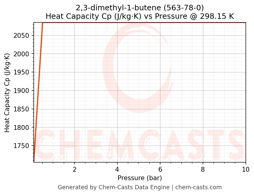 This page presents the pressure-dependent thermodynamic and transport properties of 2,3-dimethyl-1-butene (CAS 563-78-0) calculated at a constant temperature of 298 K (25 °C) over the pressure range 0.10-10 bar.