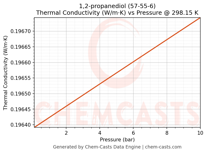 This page presents the pressure-dependent thermodynamic and transport properties of 1,2-propanediol (CAS 57-55-6) calculated at a constant temperature of 298 K (25 °C) over the pressure range 0.10-10 bar.