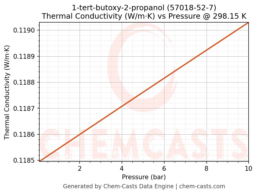 This page presents the pressure-dependent thermodynamic and transport properties of 1-tert-butoxy-2-propanol (CAS 57018-52-7) calculated at a constant temperature of 298 K (25 °C) over the pressure range 0.10-10 bar.
