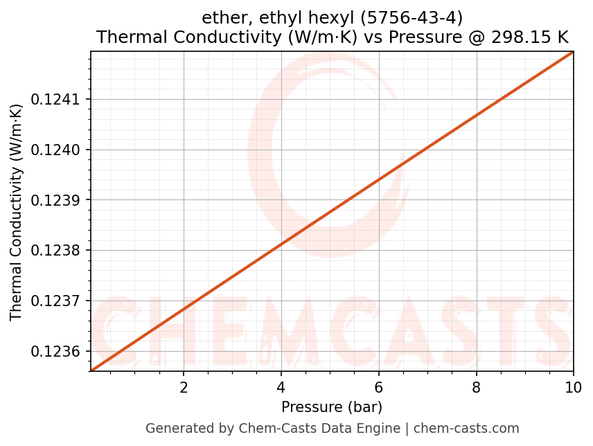 This page presents the pressure-dependent thermodynamic and transport properties of ether, ethyl hexyl (CAS 5756-43-4) calculated at a constant temperature of 298 K (25 °C) over the pressure range 0.10-10 bar.