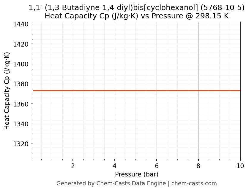 This page presents the pressure-dependent thermodynamic and transport properties of 1,1′-(1,3-Butadiyne-1,4-diyl)bis[cyclohexanol] (CAS 5768-10-5) calculated at a constant temperature of 298 K (25 °C) over the pressure range 0.10-10 bar.