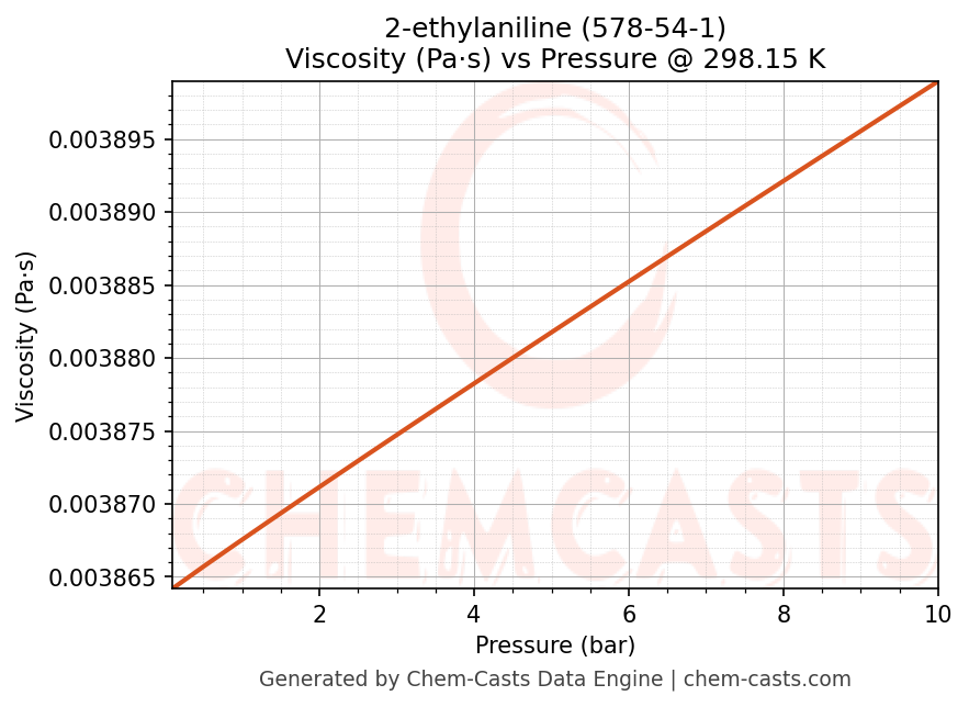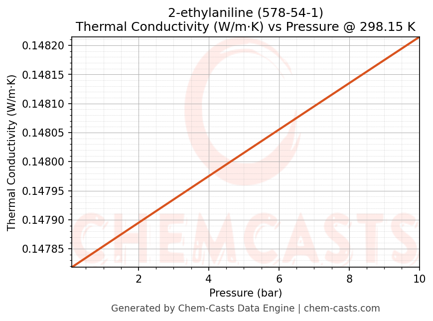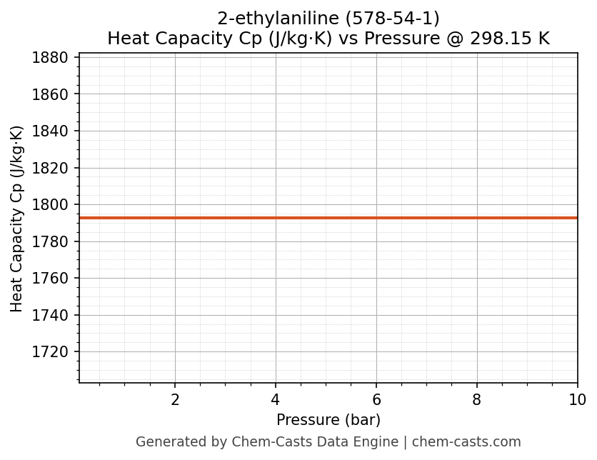 This page presents the pressure-dependent thermodynamic and transport properties of 2-ethylaniline (CAS 578-54-1) calculated at a constant temperature of 298 K (25 °C) over the pressure range 0.10-10 bar.