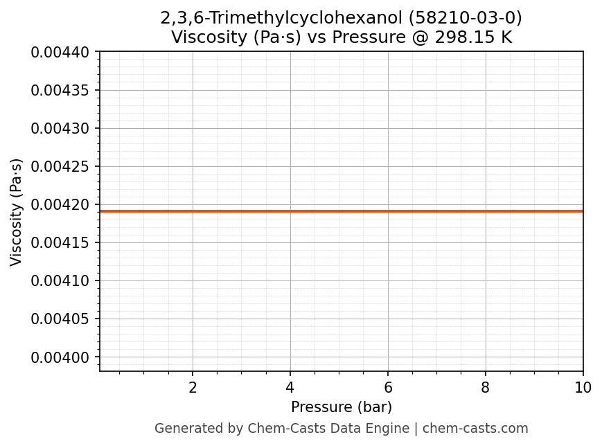 This page presents the pressure-dependent thermodynamic and transport properties of 2,3,6-Trimethylcyclohexanol (CAS 58210-03-0) calculated at a constant temperature of 298 K (25 °C) over the pressure range 0.10-10 bar.