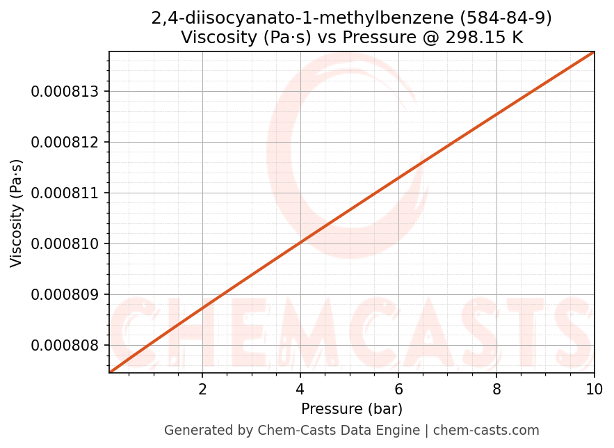This page presents the pressure-dependent thermodynamic and transport properties of 2,4-diisocyanato-1-methylbenzene (CAS 584-84-9) calculated at a constant temperature of 298 K (25 °C) over the pressure range 0.10-10 bar.