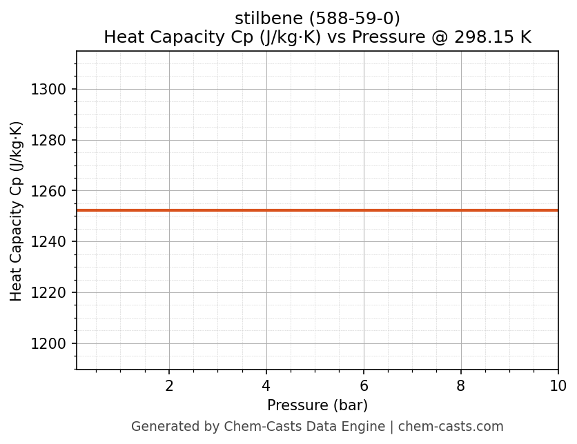 This page presents the pressure-dependent thermodynamic and transport properties of stilbene (CAS 588-59-0) calculated at a constant temperature of 298 K (25 °C) over the pressure range 0.10-10 bar.