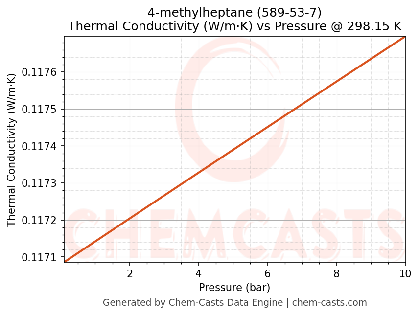 This page presents the pressure-dependent thermodynamic and transport properties of 4-methylheptane (CAS 589-53-7) calculated at a constant temperature of 298 K (25 °C) over the pressure range 0.10-10 bar.