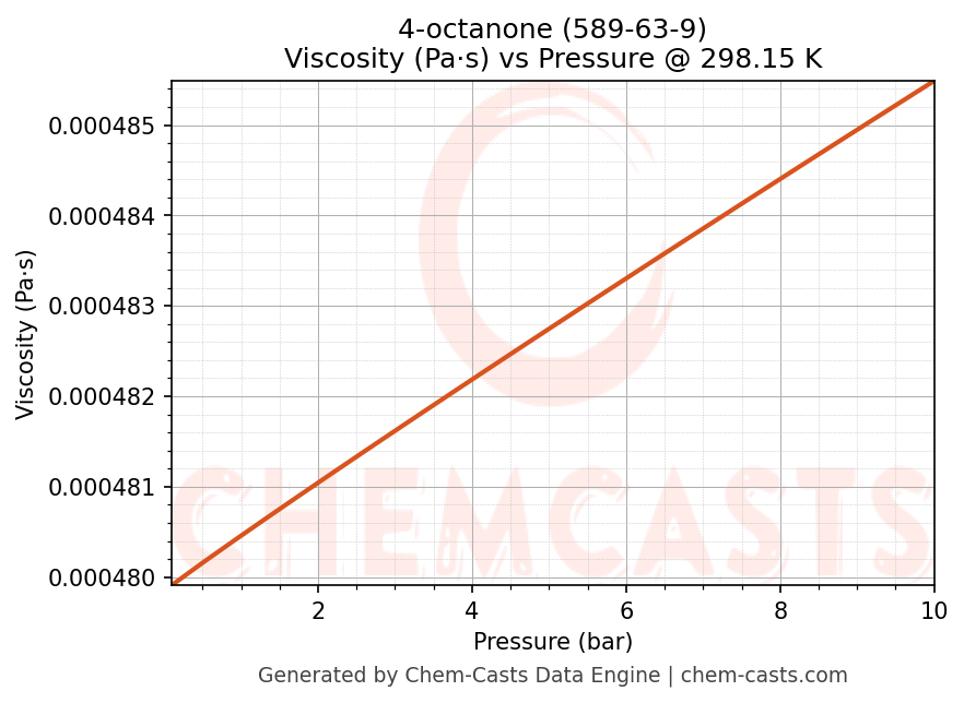 This page presents the pressure-dependent thermodynamic and transport properties of 4-octanone (CAS 589-63-9) calculated at a constant temperature of 298 K (25 °C) over the pressure range 0.10-10 bar.