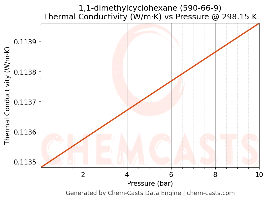 This page presents the pressure-dependent thermodynamic and transport properties of 1,1-dimethylcyclohexane (CAS 590-66-9) calculated at a constant temperature of 298 K (25 °C) over the pressure range 0.10-10 bar.