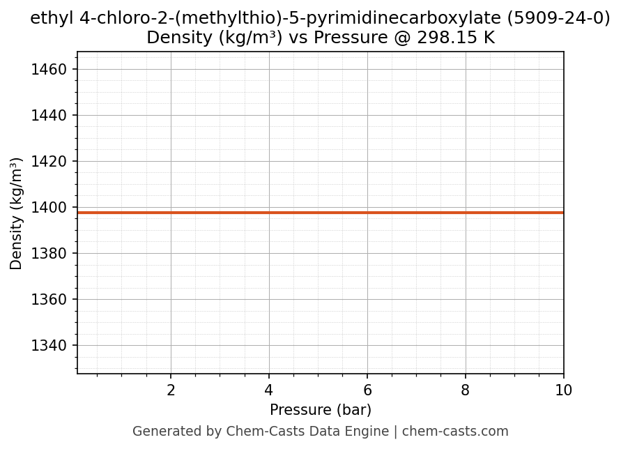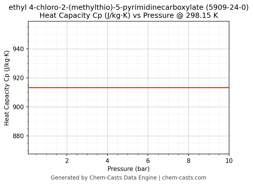 This page presents the pressure-dependent thermodynamic and transport properties of ethyl 4-chloro-2-(methylthio)-5-pyrimidinecarboxylate (CAS 5909-24-0) calculated at a constant temperature of 298 K (25 °C) over the pressure range 0.10-10 bar.