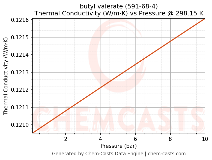 This page presents the pressure-dependent thermodynamic and transport properties of butyl valerate (CAS 591-68-4) calculated at a constant temperature of 298 K (25 °C) over the pressure range 0.10-10 bar.