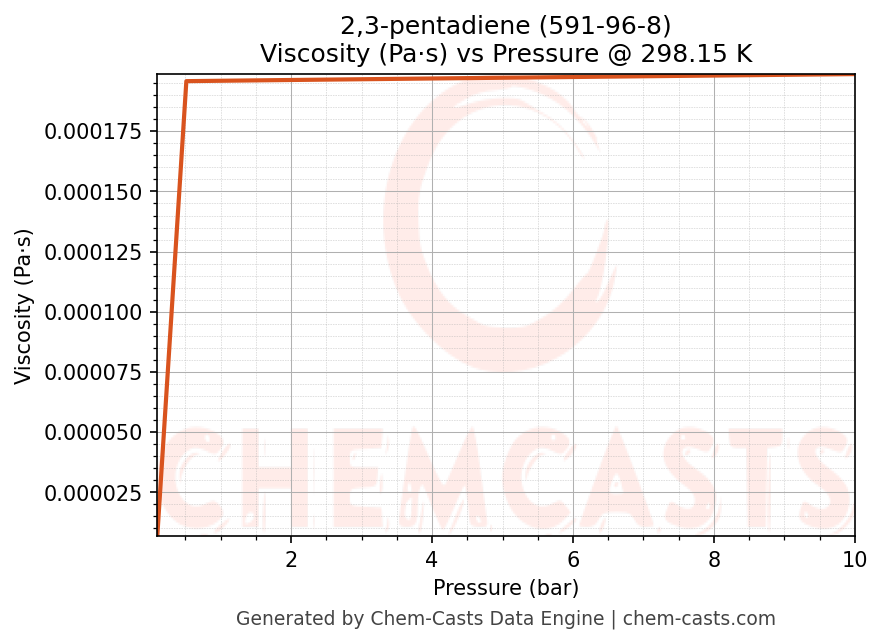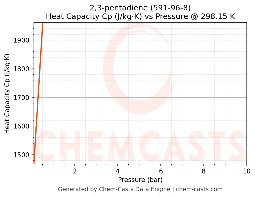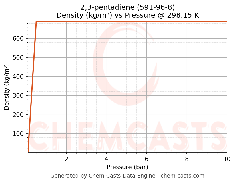 This page presents the pressure-dependent thermodynamic and transport properties of 2,3-pentadiene (CAS 591-96-8) calculated at a constant temperature of 298 K (25 °C) over the pressure range 0.10-10 bar.
