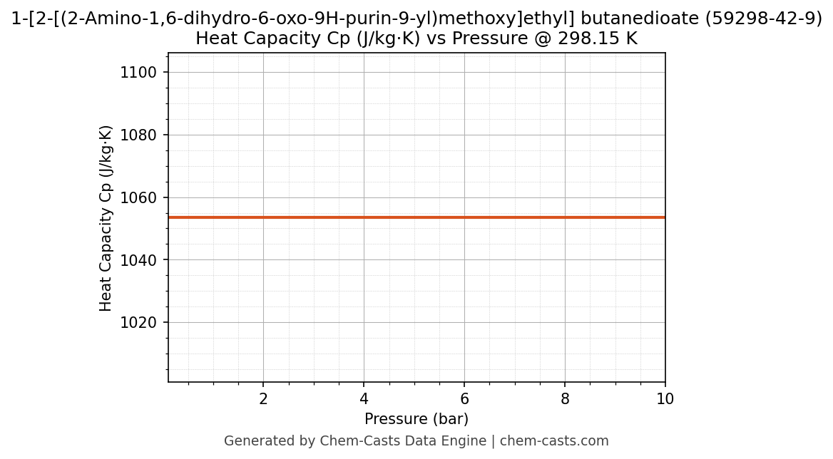 This page presents the pressure-dependent thermodynamic and transport properties of 1-[2-[(2-Amino-1,6-dihydro-6-oxo-9H-purin-9-yl)methoxy]ethyl] butanedioate (CAS 59298-42-9) calculated at a constant temperature of 298 K (25 °C) over the pressure range 0.10-10 bar.