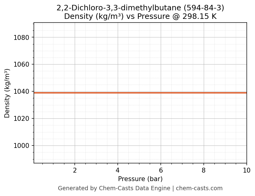 This page presents the pressure-dependent thermodynamic and transport properties of 2,2-Dichloro-3,3-dimethylbutane (CAS 594-84-3) calculated at a constant temperature of 298 K (25 °C) over the pressure range 0.10-10 bar.