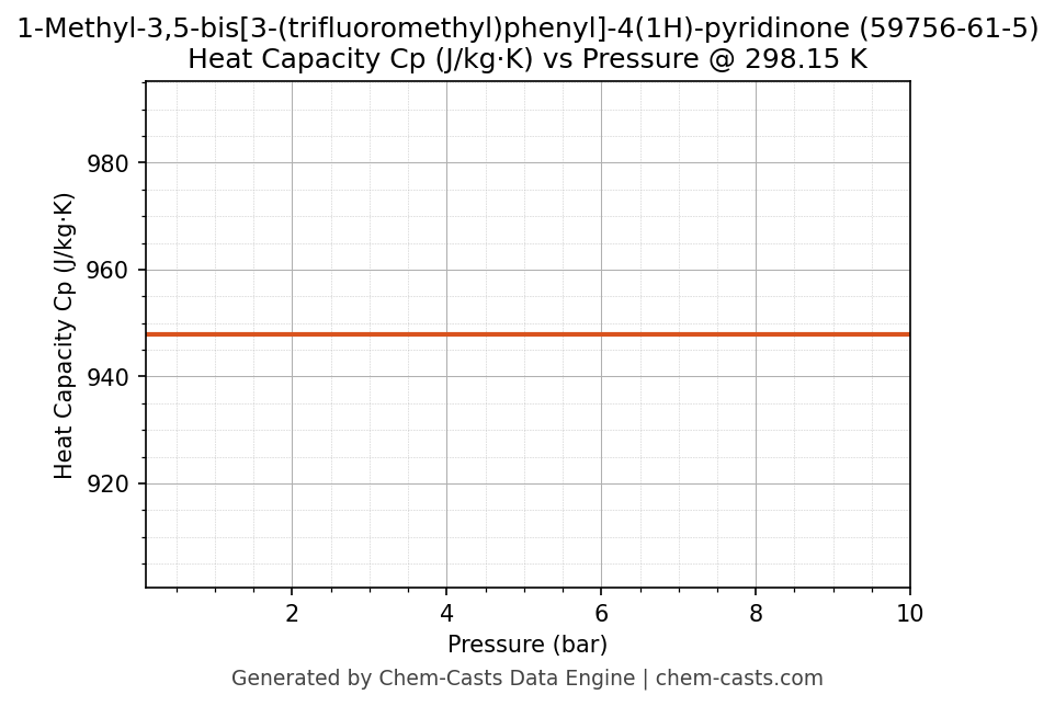 This page presents the pressure-dependent thermodynamic and transport properties of 1-Methyl-3,5-bis[3-(trifluoromethyl)phenyl]-4(1H)-pyridinone (CAS 59756-61-5) calculated at a constant temperature of 298 K (25 °C) over the pressure range 0.10-10 bar.