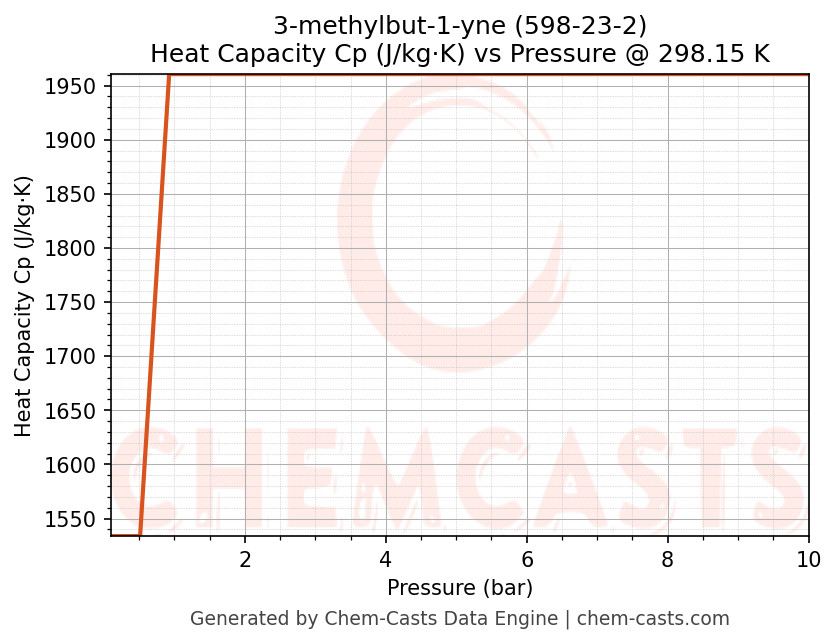 This page presents the pressure-dependent thermodynamic and transport properties of 3-methylbut-1-yne (CAS 598-23-2) calculated at a constant temperature of 298 K (25 °C) over the pressure range 0.10-10 bar.