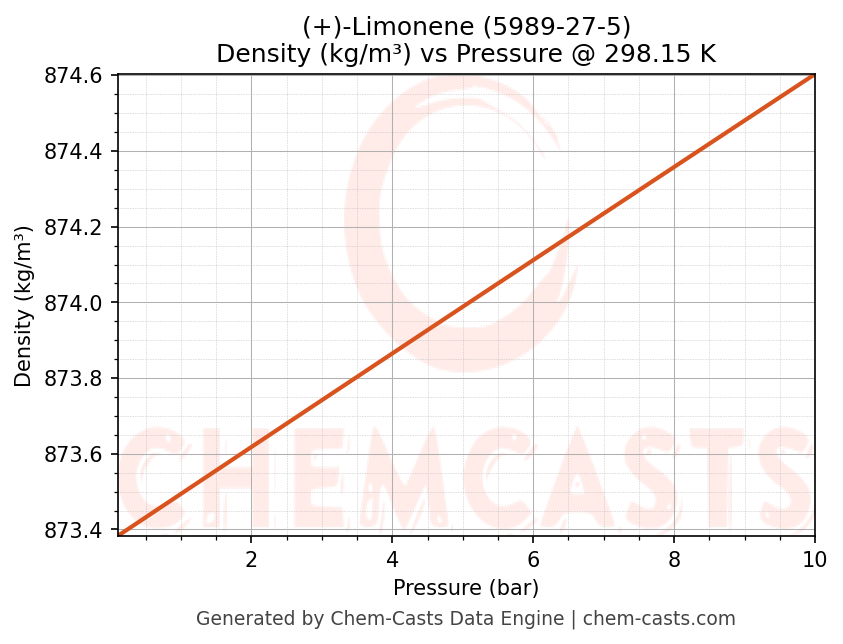 This page presents the pressure-dependent thermodynamic and transport properties of (+)-Limonene (CAS 5989-27-5) calculated at a constant temperature of 298 K (25 °C) over the pressure range 0.10-10 bar.