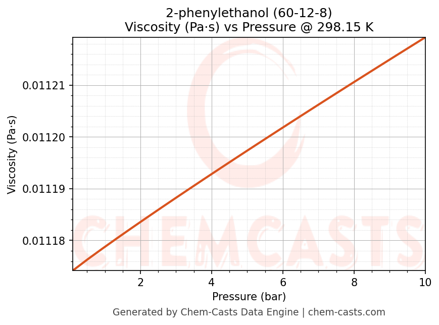 This page presents the pressure-dependent thermodynamic and transport properties of 2-phenylethanol (CAS 60-12-8) calculated at a constant temperature of 298 K (25 °C) over the pressure range 0.10-10 bar.