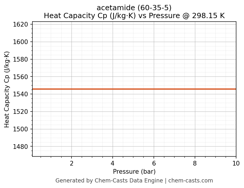 This page presents the pressure-dependent thermodynamic and transport properties of acetamide (CAS 60-35-5) calculated at a constant temperature of 298 K (25 °C) over the pressure range 0.10-10 bar.