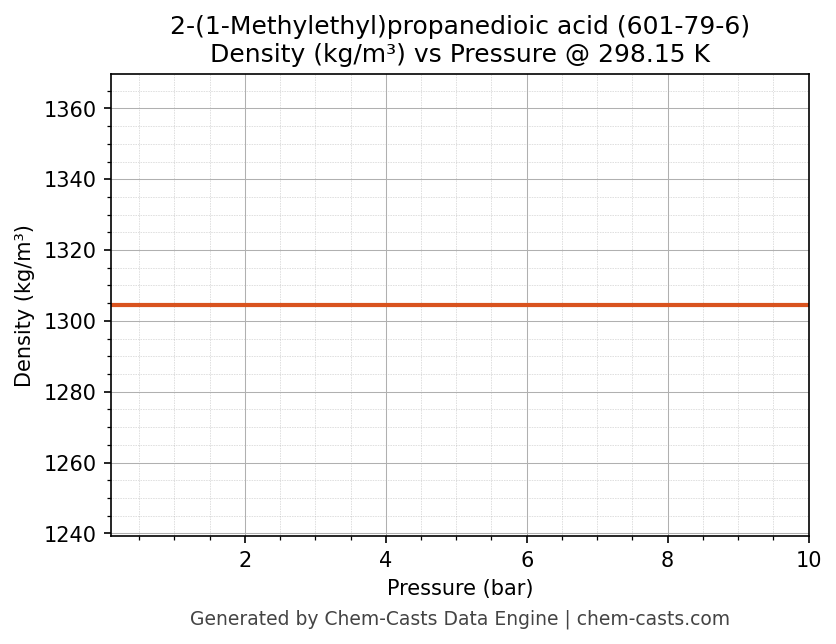 This page presents the pressure-dependent thermodynamic and transport properties of 2-(1-Methylethyl)propanedioic acid (CAS 601-79-6) calculated at a constant temperature of 298 K (25 °C) over the pressure range 0.10-10 bar.