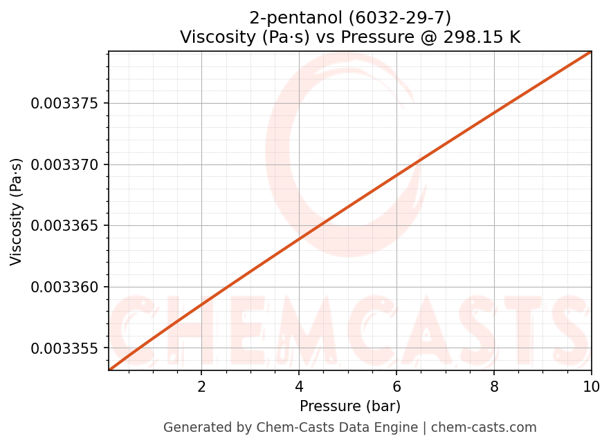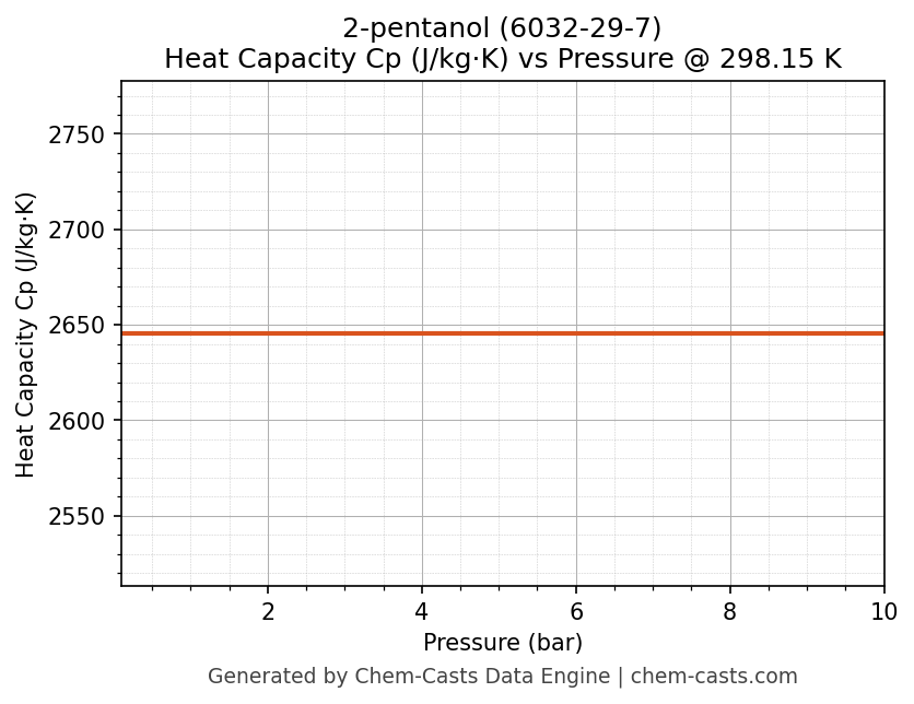 This page presents the pressure-dependent thermodynamic and transport properties of 2-pentanol (CAS 6032-29-7) calculated at a constant temperature of 298 K (25 °C) over the pressure range 0.10-10 bar.