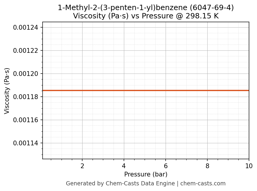 This page presents the pressure-dependent thermodynamic and transport properties of 1-Methyl-2-(3-penten-1-yl)benzene (CAS 6047-69-4) calculated at a constant temperature of 298 K (25 °C) over the pressure range 0.10-10 bar.