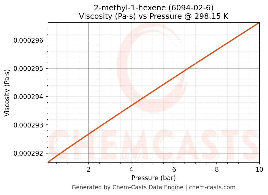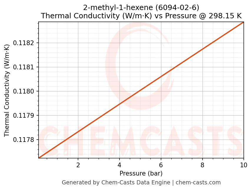 This page presents the pressure-dependent thermodynamic and transport properties of 2-methyl-1-hexene (CAS 6094-02-6) calculated at a constant temperature of 298 K (25 °C) over the pressure range 0.10-10 bar.