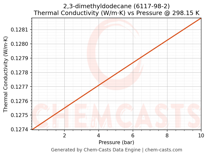 This page presents the pressure-dependent thermodynamic and transport properties of 2,3-dimethyldodecane (CAS 6117-98-2) calculated at a constant temperature of 298 K (25 °C) over the pressure range 0.10-10 bar.