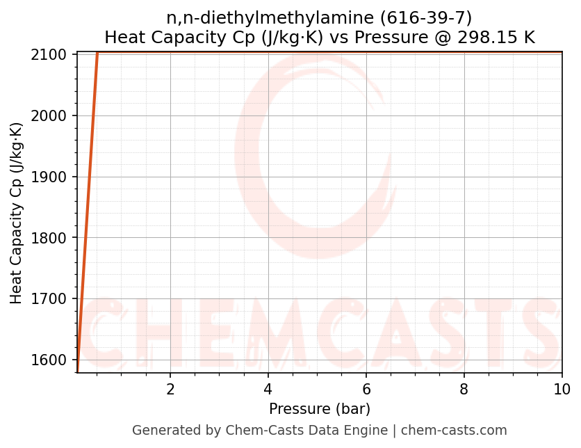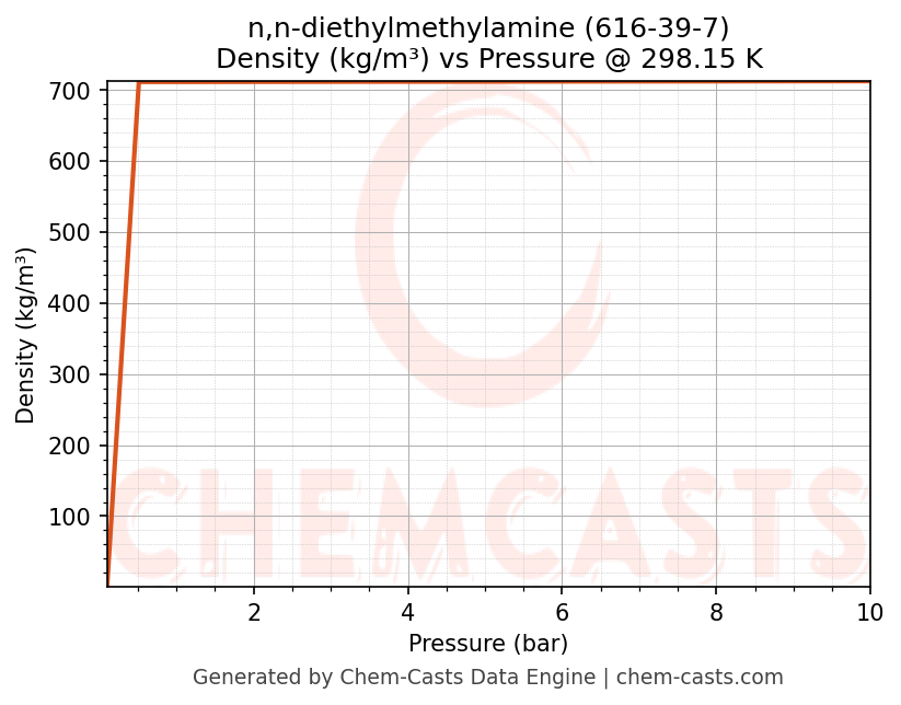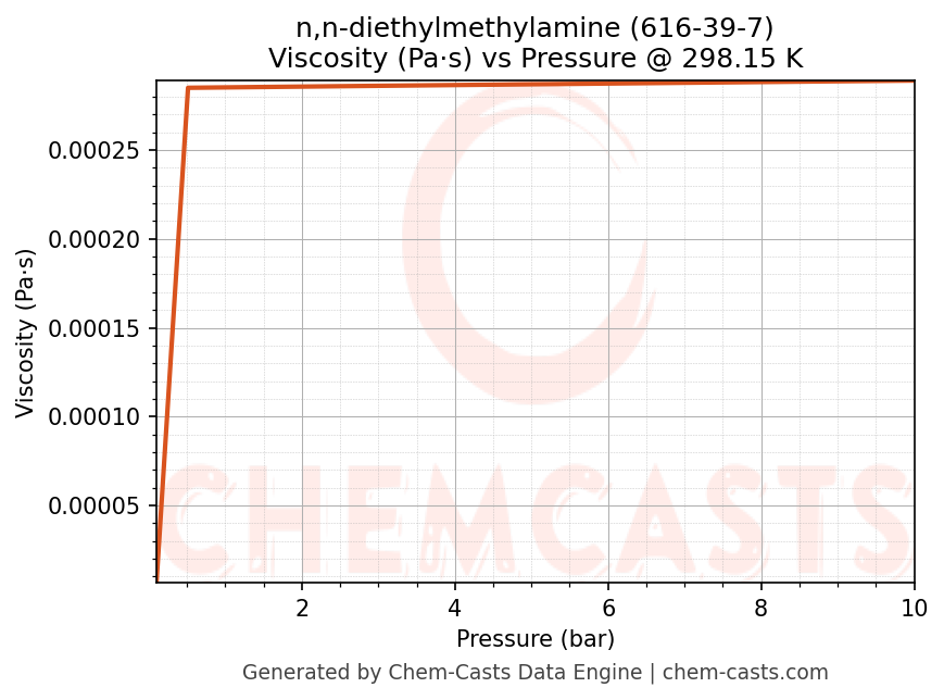 This page presents the pressure-dependent thermodynamic and transport properties of n,n-diethylmethylamine (CAS 616-39-7) calculated at a constant temperature of 298 K (25 °C) over the pressure range 0.10-10 bar.