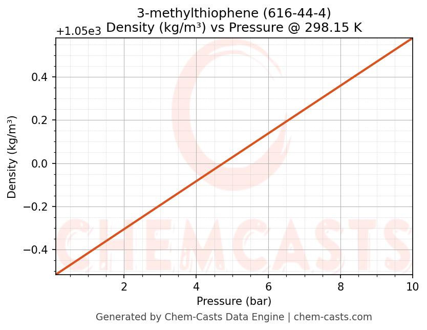 This page presents the pressure-dependent thermodynamic and transport properties of 3-methylthiophene (CAS 616-44-4) calculated at a constant temperature of 298 K (25 °C) over the pressure range 0.10-10 bar.
