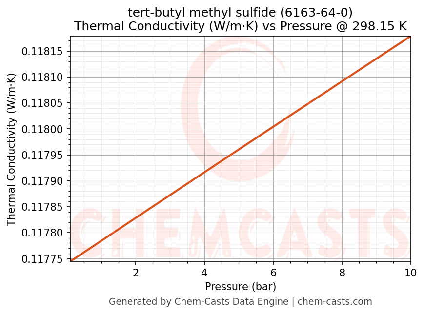 This page presents the pressure-dependent thermodynamic and transport properties of tert-butyl methyl sulfide (CAS 6163-64-0) calculated at a constant temperature of 298 K (25 °C) over the pressure range 0.10-10 bar.