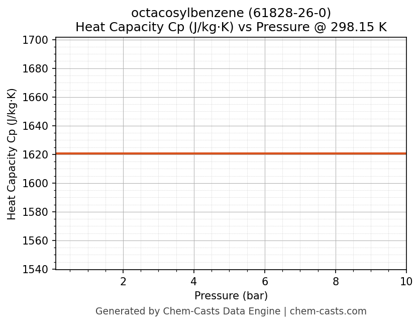 This page presents the pressure-dependent thermodynamic and transport properties of octacosylbenzene (CAS 61828-26-0) calculated at a constant temperature of 298 K (25 °C) over the pressure range 0.10-10 bar.