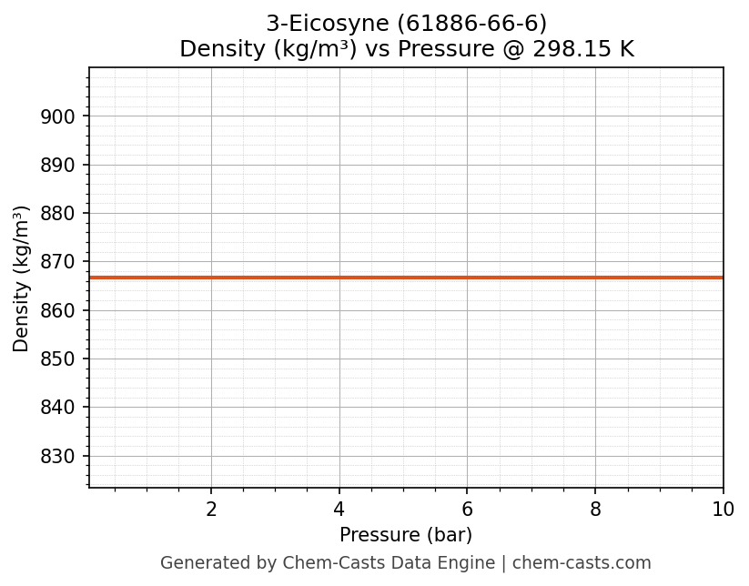 This page presents the pressure-dependent thermodynamic and transport properties of 3-Eicosyne (CAS 61886-66-6) calculated at a constant temperature of 298 K (25 °C) over the pressure range 0.10-10 bar.