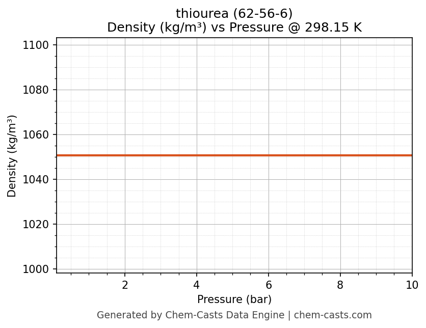 This page presents the pressure-dependent thermodynamic and transport properties of thiourea (CAS 62-56-6) calculated at a constant temperature of 298 K (25 °C) over the pressure range 0.10-10 bar.