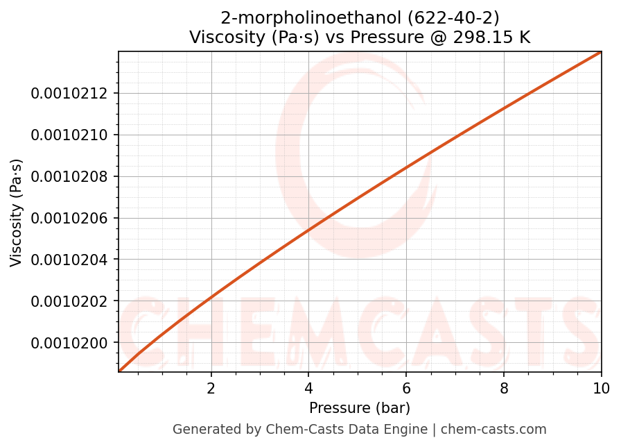 This page presents the pressure-dependent thermodynamic and transport properties of 2-morpholinoethanol (CAS 622-40-2) calculated at a constant temperature of 298 K (25 °C) over the pressure range 0.10-10 bar.