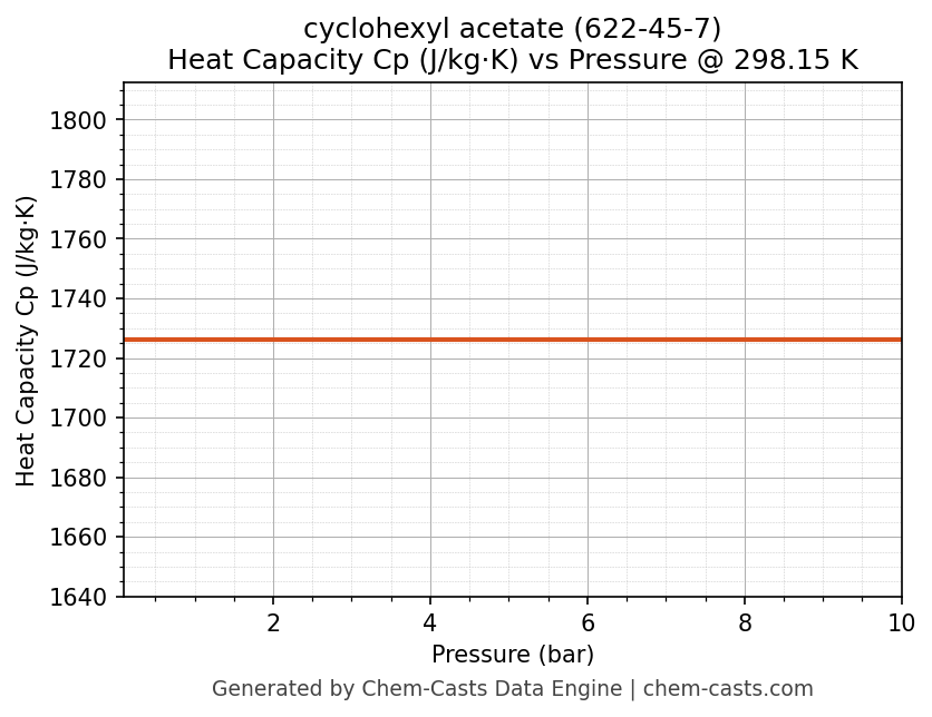This page presents the pressure-dependent thermodynamic and transport properties of cyclohexyl acetate (CAS 622-45-7) calculated at a constant temperature of 298 K (25 °C) over the pressure range 0.10-10 bar.