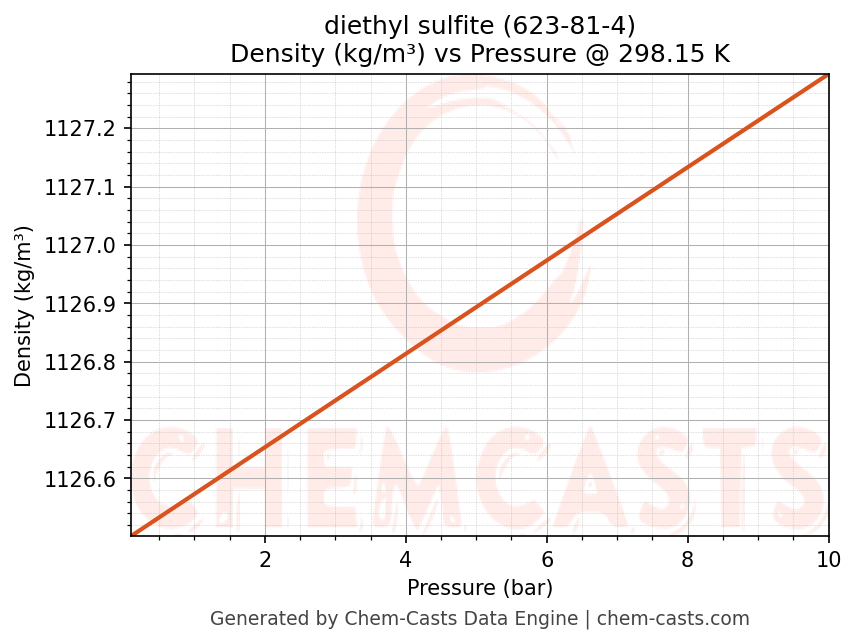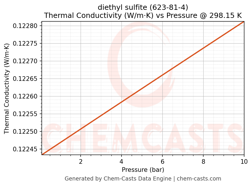 This page presents the pressure-dependent thermodynamic and transport properties of diethyl sulfite (CAS 623-81-4) calculated at a constant temperature of 298 K (25 °C) over the pressure range 0.10-10 bar.
