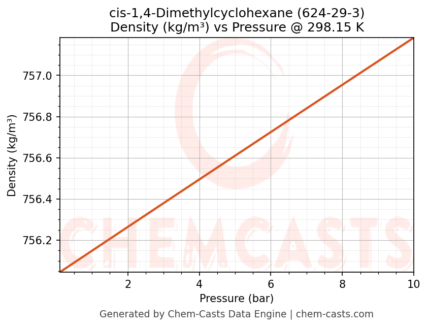 This page presents the pressure-dependent thermodynamic and transport properties of cis-1,4-Dimethylcyclohexane (CAS 624-29-3) calculated at a constant temperature of 298 K (25 °C) over the pressure range 0.10-10 bar.
