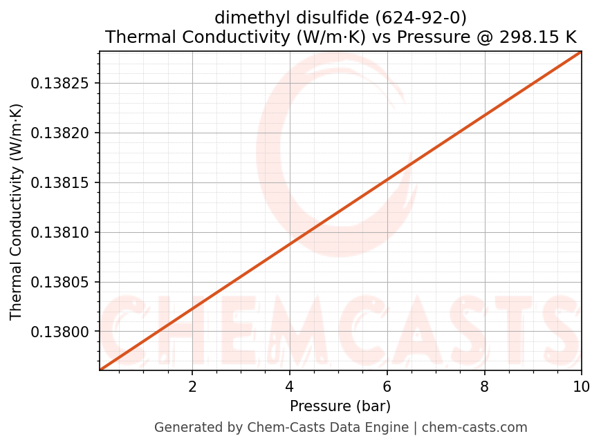 This page presents the pressure-dependent thermodynamic and transport properties of dimethyl disulfide (CAS 624-92-0) calculated at a constant temperature of 298 K (25 °C) over the pressure range 0.10-10 bar.