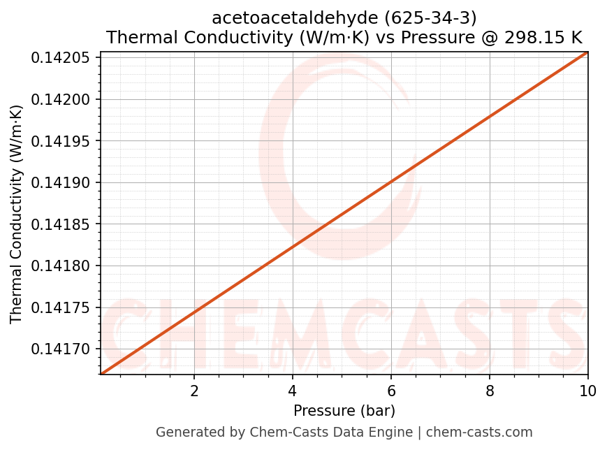This page presents the pressure-dependent thermodynamic and transport properties of acetoacetaldehyde (CAS 625-34-3) calculated at a constant temperature of 298 K (25 °C) over the pressure range 0.10-10 bar.