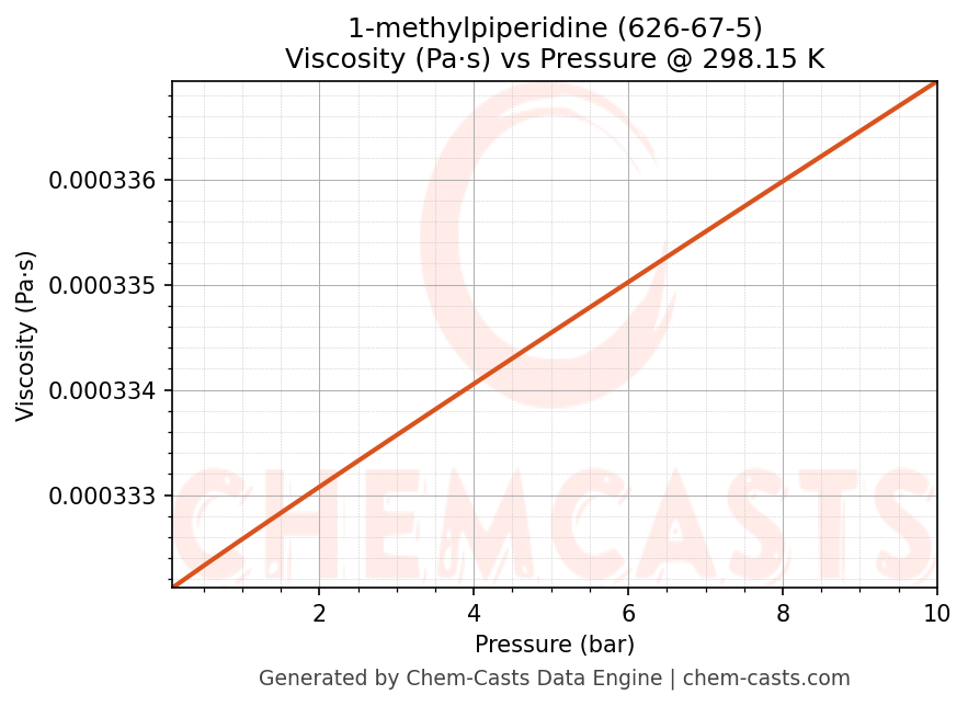 This page presents the pressure-dependent thermodynamic and transport properties of 1-methylpiperidine (CAS 626-67-5) calculated at a constant temperature of 298 K (25 °C) over the pressure range 0.10-10 bar.