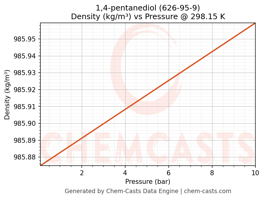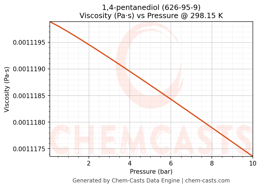 This page presents the pressure-dependent thermodynamic and transport properties of 1,4-pentanediol (CAS 626-95-9) calculated at a constant temperature of 298 K (25 °C) over the pressure range 0.10-10 bar.