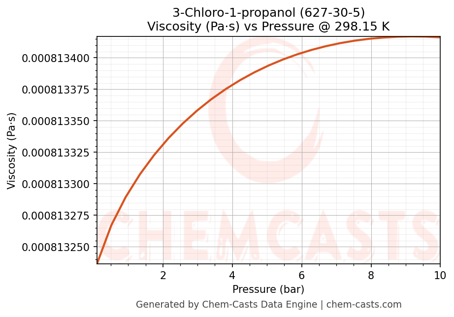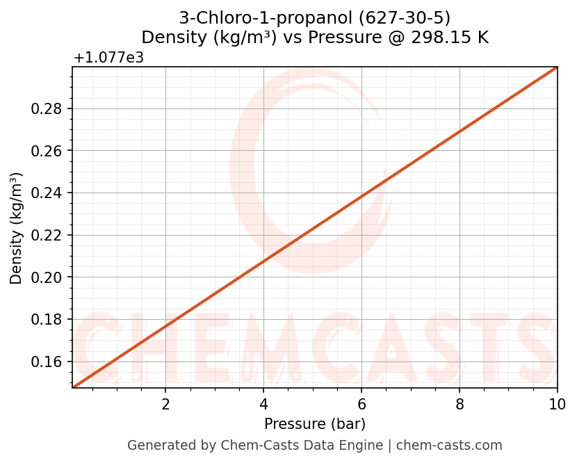 This page presents the pressure-dependent thermodynamic and transport properties of 3-Chloro-1-propanol (CAS 627-30-5) calculated at a constant temperature of 298 K (25 °C) over the pressure range 0.10-10 bar.