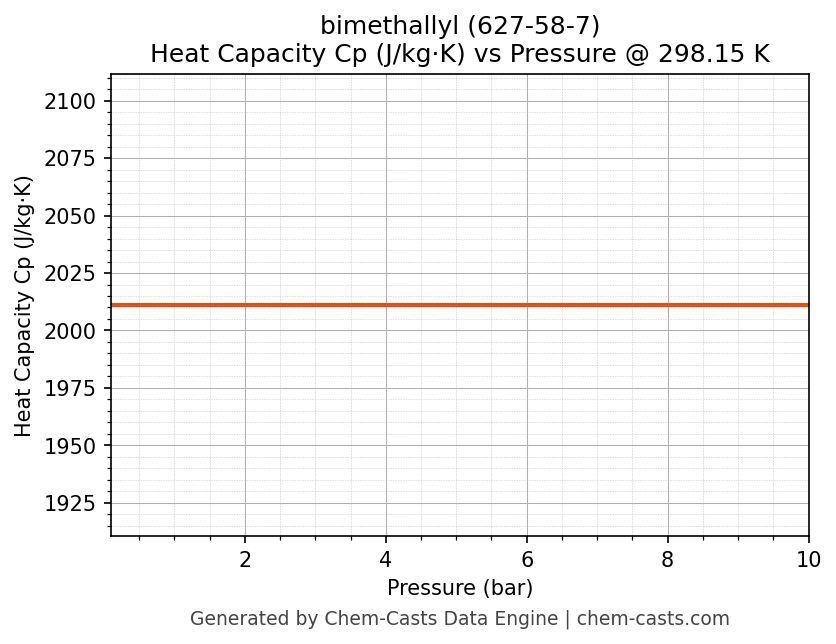 This page presents the pressure-dependent thermodynamic and transport properties of bimethallyl (CAS 627-58-7) calculated at a constant temperature of 298 K (25 °C) over the pressure range 0.10-10 bar.