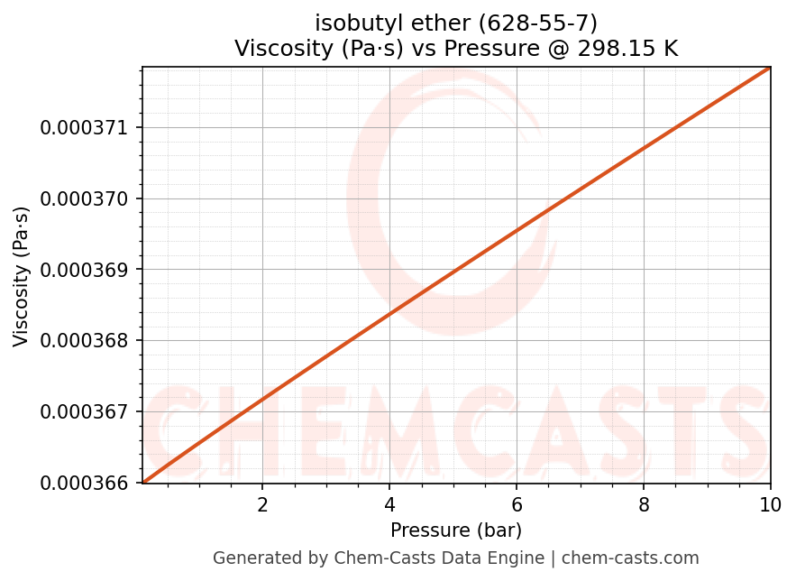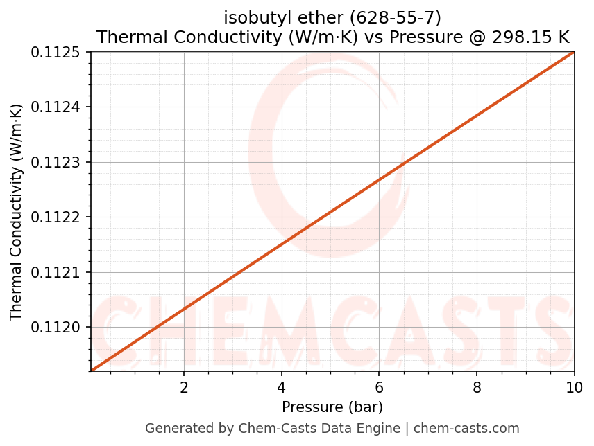 This page presents the pressure-dependent thermodynamic and transport properties of isobutyl ether (CAS 628-55-7) calculated at a constant temperature of 298 K (25 °C) over the pressure range 0.10-10 bar.