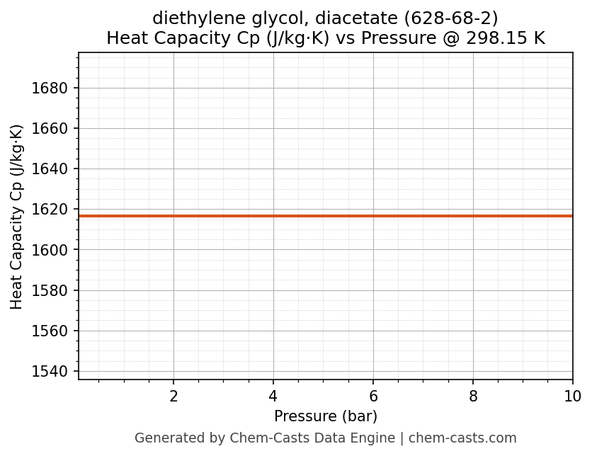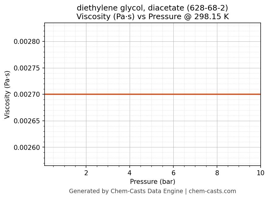 This page presents the pressure-dependent thermodynamic and transport properties of diethylene glycol, diacetate (CAS 628-68-2) calculated at a constant temperature of 298 K (25 °C) over the pressure range 0.10-10 bar.