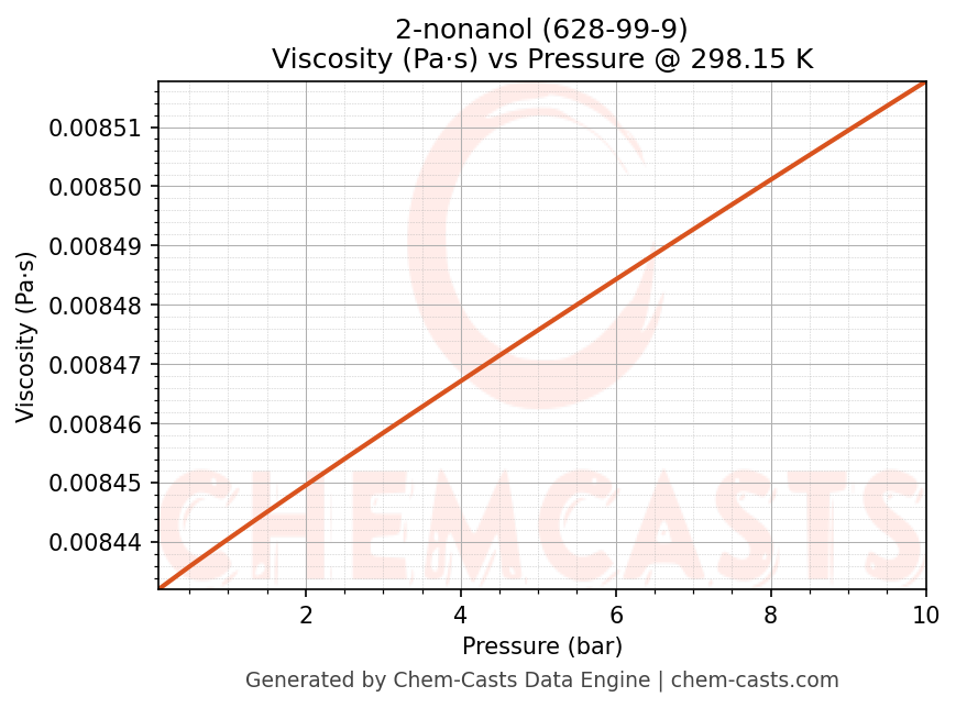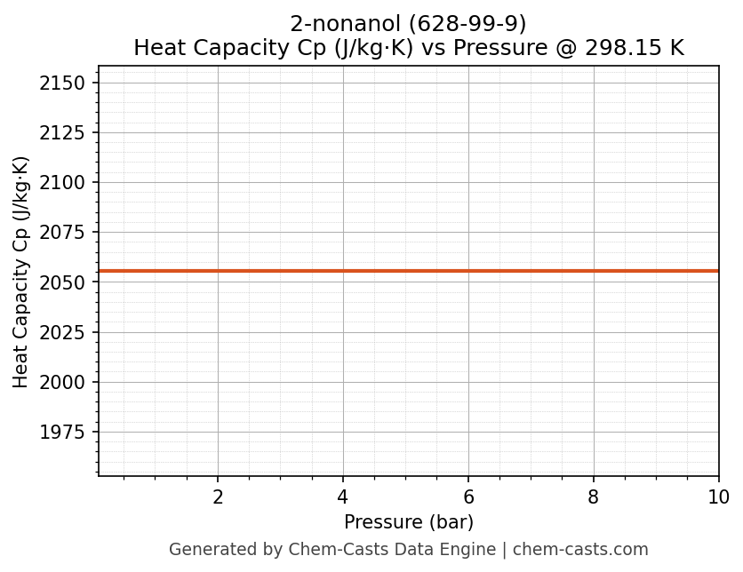 This page presents the pressure-dependent thermodynamic and transport properties of 2-nonanol (CAS 628-99-9) calculated at a constant temperature of 298 K (25 °C) over the pressure range 0.10-10 bar.